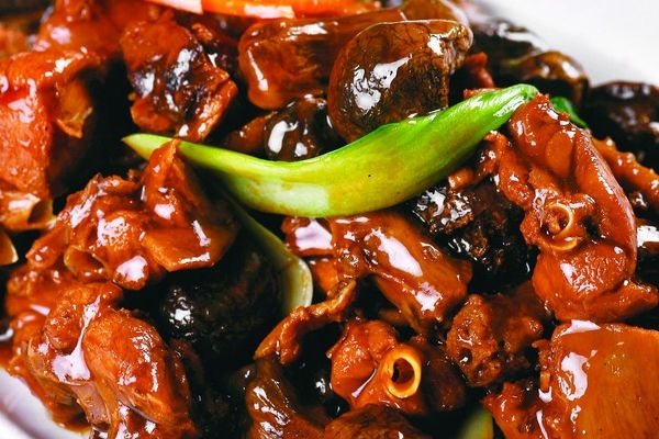 3、鍋內(nèi)注入食用油燒至6成放入小米辣,姜片、花椒煽出香味放入雞塊翻炒半分鐘,放入黃酒,用鍋蓋燜1分鐘,放入松茸翻炒至9成熟再放入蒜片,香蔥,雞粉及老抽等調(diào)料翻炒至成熟出鍋裝盤即可。